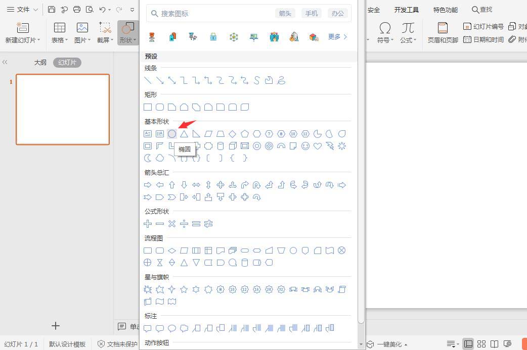 1、在插入选项卡中点击形状,选择其中的椭圆。