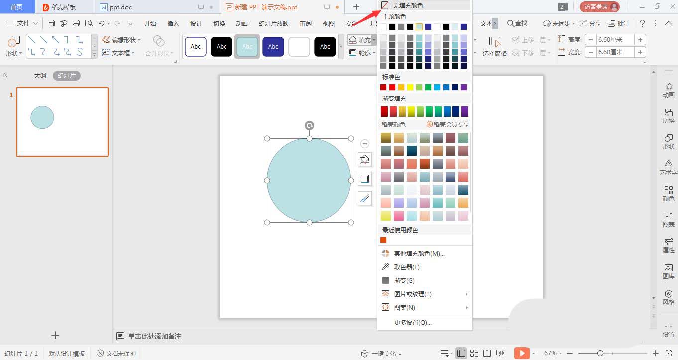 3、选中圆形,在绘图工具中点击填充,选择其中的“无填充颜色”。