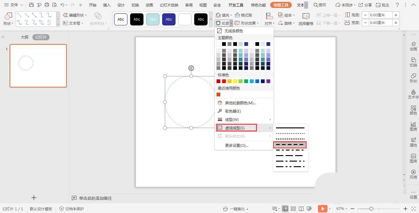 4、点击轮廓,选择其中的线型——虚线类型,选择其中合适的虚线类型。