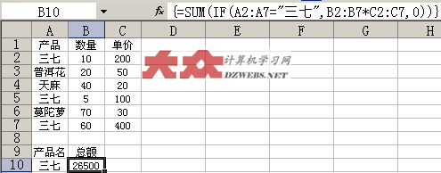 上表中,我们所使用的公式为:{=SUM(IF(A2:A7="三七",B2:B7*C2:C7,0))},这样就能计算出结果了。