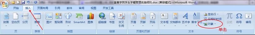 2、选择上面的“插入”,单击偏右边一点的“对象”。