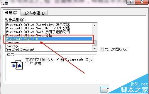 3、弹出了一个对象选择框。将下拉条往下拉,找到“Microsoft 公式 3.0 ”单击选定它,确定。