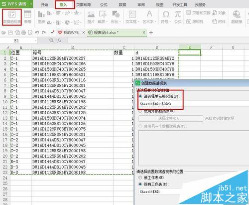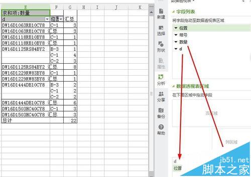 4、“插入—数据透视表”,选择d,数量,位置三列做数据透视,数据区域选择数量(默认求和),行区域选择d和位置,这个决定透视表格的内容。