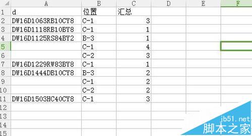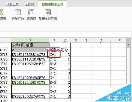 5、得到的数据透视表如图,显示的每个物料号(d)在每个位置的汇总,但是因为我们要进行后续工作,所以不能显示每个分类的汇总。