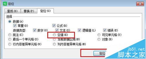 8、选择物料号(d那列)选择有内容的区域,找到“查找—定位”,在定位框找到“空值”,此时选中所有空值,空白部分应该和该分类的第一行内容一样。