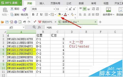 9、输入=上一行,按下Ctrl+Enter,填充所有空白内容即可。完成后如图,显示的物料按位置的汇总数量。同时点击上面的填充,涂色方便大家看到。