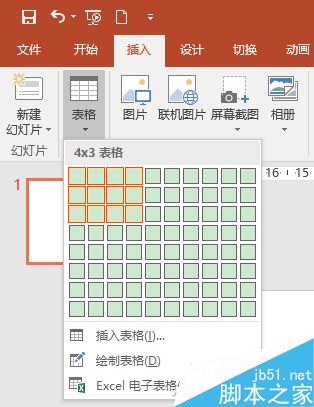 在PowerPoint 2016中,切换到“插入”选项卡,点击“表格”,再从弹出对话框中设置几行几列,即可得到一个默认为蓝色渐变的表格。