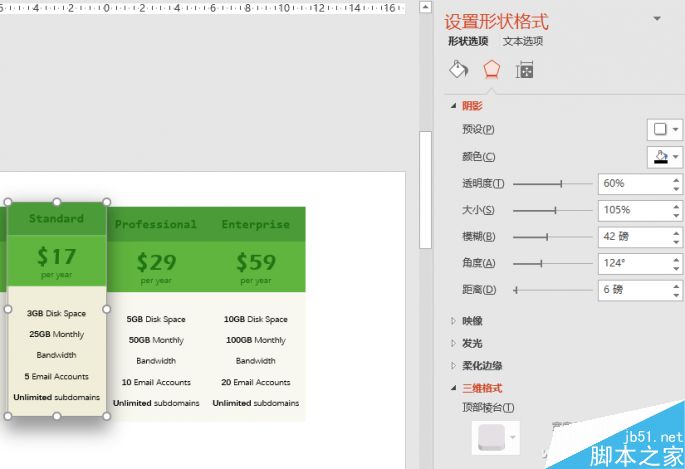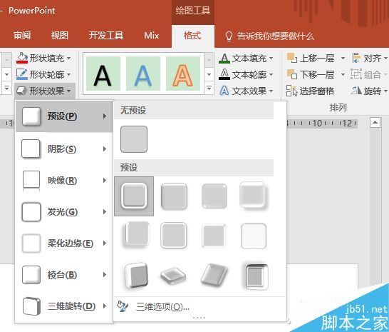 这么酷的一个立体表格,仅通过PowerPoint的表格工具是很难完成的。而其实它的制作也很简单。切换到“插入”选项卡,点击“形状”,选择绘制一个圆角矩形。选中此矩形,再切换到“绘图工具-格式”选项卡中,点击“形状效果”,选中“预设”中的第一个效果即可。