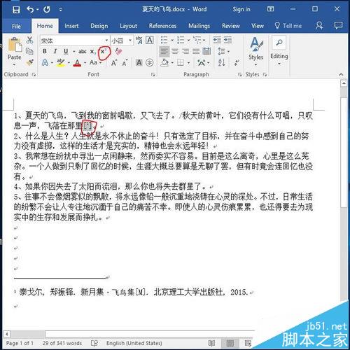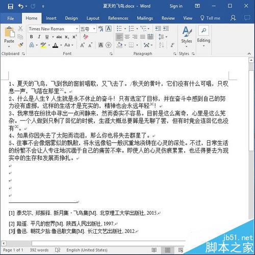 1、本经验以以下文字为例。其中有5句名言,分别是从三部著作者摘录,分别是飞鸟集、朝花夕拾、平凡的世界。我们想要在每句的结尾标注参考来源,分别用到了引用和交叉引用。图1为具体需要引用参考文献的例子。