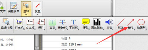 2、点击PDF文件编辑器中工具栏中的注释工具,在注释工具下拉菜单中选择箭头工具,鼠标左键点击箭头工具。如图所示: