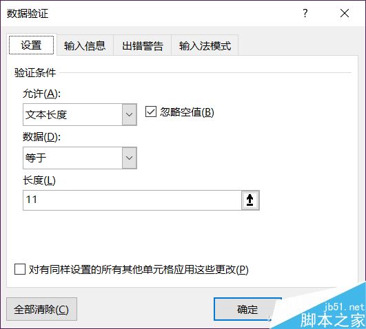 在弹出的界面中,设置允许部分改为“文本长度”,数据设置“等于”,长度填写“11”再点击确定。如此一来,这一列中所有的单元格都必须输入11位的数字才能够正确输入。