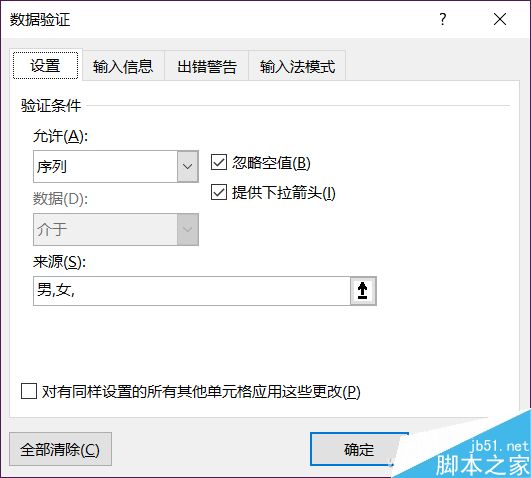 且慢,你是不是以为只能数字限制,性别处就无法设置了?当然不是,小编之所以能提出来,自然有解决办法。老样子先选中性别一列(不包括名称栏),然后再允许部分选择“序列”,来源部分写上“男,女,”注意逗号为英文半角。另外确认“序列”右侧“提供下拉箭头”为勾选状态。