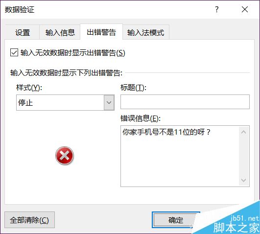 没关系,回到数据验证(分别选择对应列后),切换到“出错警告”,在错误信息处写下个性化的报错方式,一下就会显得更加人性化了。
