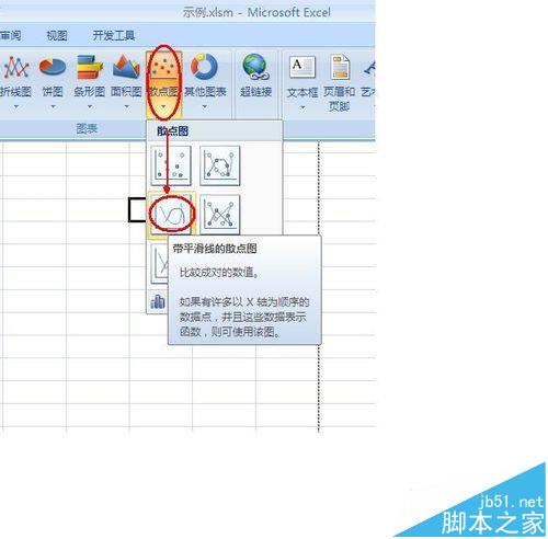 1、在功能区中选择“插入”选项卡,在“图表”组中依次单击“散点图→带平滑线的散点图”。