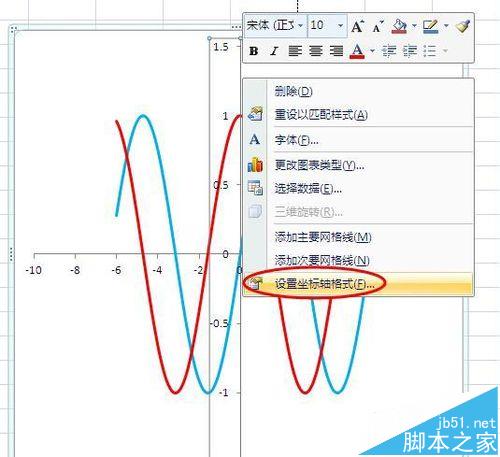 10、然后,在设置一下函数图像的线条颜色和线型,鼠标在函数图像上右击,在弹出的快捷菜单中选择“设置数据系列格式”。