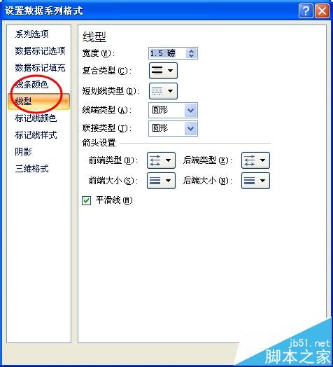 11、在弹出的“设置数据系列格式”对话框中的“线条颜色”、“线型”栏目中,分别设置函数图像的线条颜色和线型。
