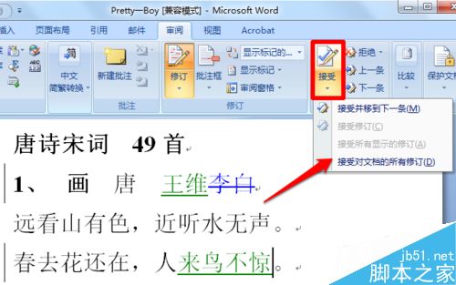 7、将光标定位在被修订的地方,然后可以选择word接受修订或者word接受所有修订。