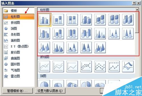 3、在打开的“插入图表”窗口中可以看到柱状图