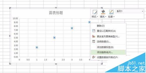 4、散点图好了以后,用鼠标任意选择一个点,单击鼠标右键,选择“添加趋势线”。如图。