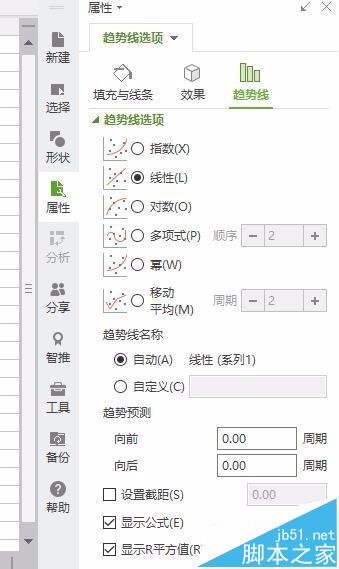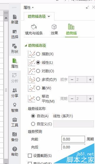 6、同时,右侧的属性栏也出现了有关趋势线的设置。在这里你可以选择趋势线的各种选项,有线性,指数等。