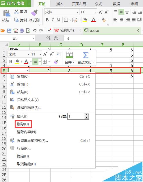 2、这时如果删除第5行,序号那一列就不连续了
