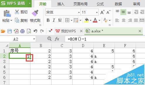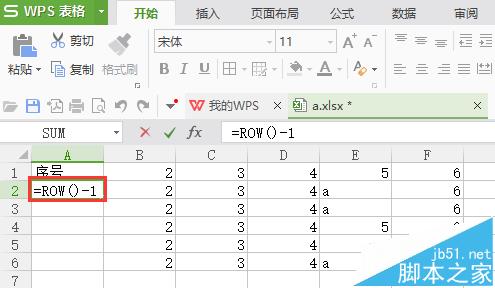 3、让序号那一列一直连续的方法。清空序号那一列,在第一个位置输入“=ROW()-1”,ROW()获取当前行号