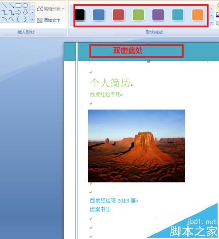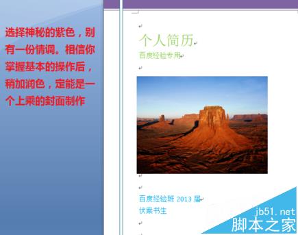 6、双击淡青色区域,你还可以进行颜色的更换,让我们换成女孩子比较青睐的神秘的紫色,是不是整个页面别有另一番情调。本次示范仅演示如何设计。具体的美工过程不是一句两句讲得清的,还需自己多为考虑进行详细的斟酌配色,当然也可以参考他人的配色习惯。这样的封面比起网上的下载封面。相信即使你作为主考官或者面试官。也会为面试者加上些许印象分。