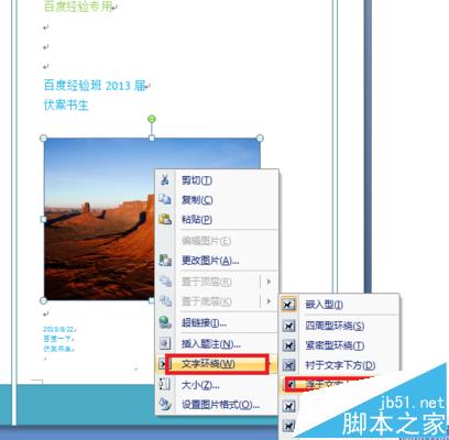 4、整个页面看起来比较的空旷,那么让我们找个图片插入进来吧。我随便找了张。粘贴后,选择右键,文字环绕,浮于文字上方。这样整个图片就可以不受限制的随意拖动位置了