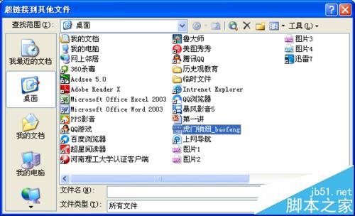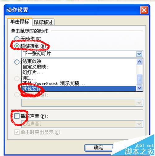 3、设置视频播放按钮的动作。选择“超链接”,在下拉框里选择“其他文件”,选择要插入的视频,并点击“确定”即可。