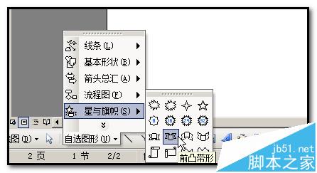5、在绘图工具栏中点选“前凸带形”;在文档上画出图形,并把图形调整如图中的所示的形状大小;