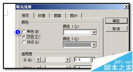 7、弹出“填充效果”操作框;点选“双色”;在“颜色1”右侧的小三角形中点下,弹出的菜单中点选“灰色-80%”;