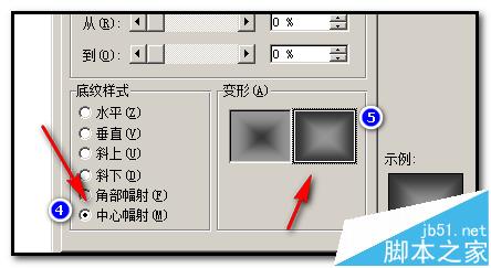 8、在“颜色2”右侧小三角形这里点下,弹出的菜单中点选“灰色-40%”;在“底纹样式”这里点选“中心辐射”;在“变形”这里点选第二个变形;点确定。