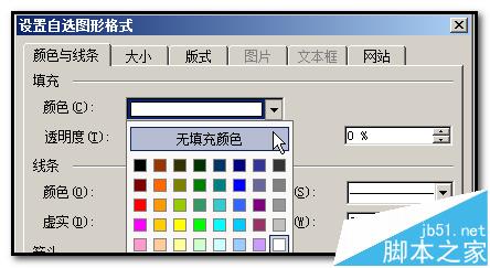 12、双击图形,弹出“设置自选图形格式”操作框;在“填充颜色”右侧的小三角形这里点下;弹出的菜单中点选“无填充颜色”;再点确定;