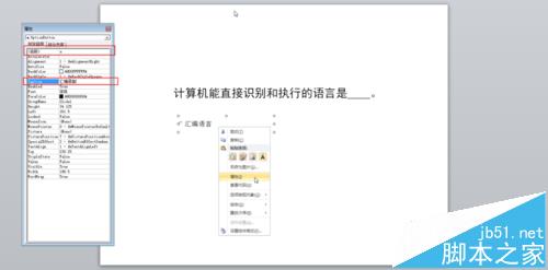 4、在选项按钮控件上单击鼠标右键,点击“属性”。在属性面板中,修改选项按钮的名称为“a”,caption为“汇编语言”。