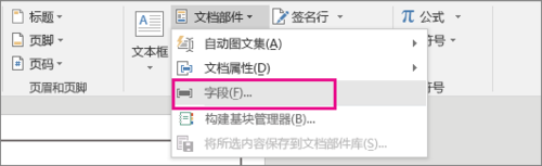 3、在“插入”选项卡上,单击“文档部件”>“域”。