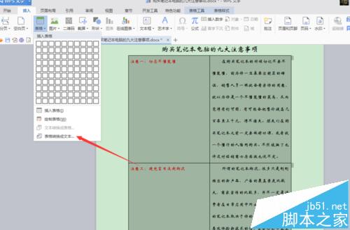 5、点击上方的“表格”命令选项后,会弹出下拉窗格,点击“文本转换成表格”命令选项,如图所示;