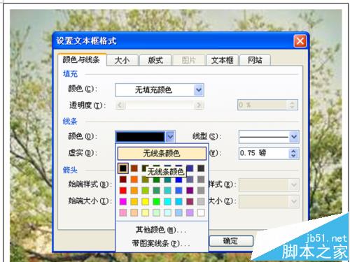 6、同样在该对话框中设置线条颜色为无颜色填充,点击确定按钮,设置完毕。