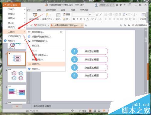 2、在打开的Wps文稿窗口,点击左上角Wps演示下拉按钮,在弹出的选项框中,依次点击“工具”-->“选项”命令选项。如图所示;