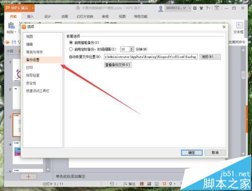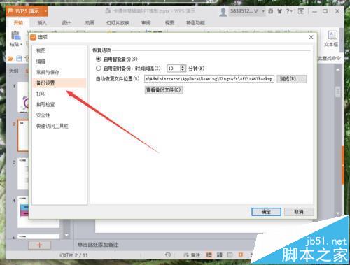 5、在选项对话框中,选择左侧的“备份设置”选项卡栏。如图所示;