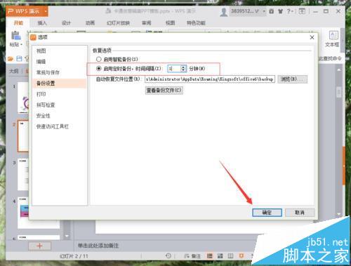 6、在备份设置选项卡的右侧窗格中,选择恢复选项下的“启用定时备份”,并将时间间隔设置为我们需要的时间。如“5分钟”。再点击“确定”按钮即可。如图所示;