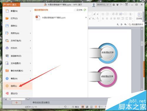 3、在打开的wps演示对话框中,选择“选项”命令选项点击它。如图所示;