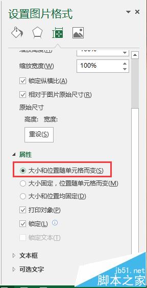 4、点击右侧的属性框,然后选择 大小和位置随单元格而变: