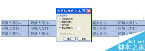 5、在弹出的表格转换为文本的对话框中,可以选择表格中文本文字的分割符,比如制表符,逗号,同时也可以根据自己的需要,设置分隔符号