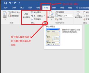2、在word顶端先中引用工具栏,按下插入脚注选项卡右下脚有个小箭头的方框