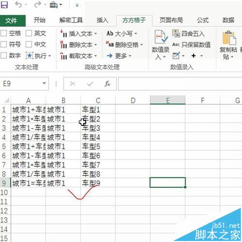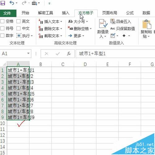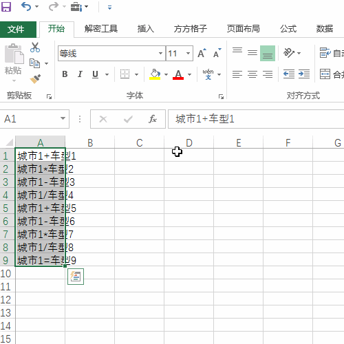 1、首先打开表格,发现A列之间的字符由不同的符号进行了链接,选中数据,选择方方格子按钮,如下图所示: