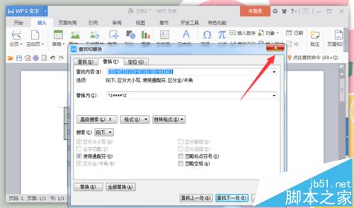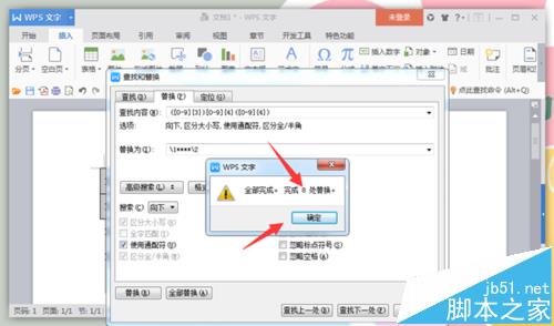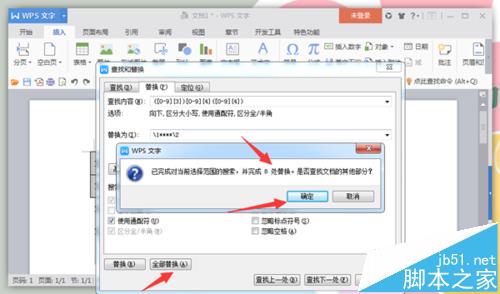 3、在弹出的“查找与替换”对话框中,在查找内容处输入“([0-9]{3})[0-9]{4}([0-9]{4})”,在替换为处输入:“\1****\2”。然后选择“高级搜索”中的“使用通配符”,最后点击“全部替换”即可。