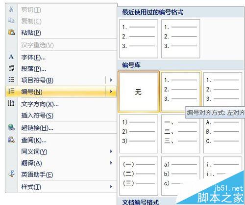 1、鼠标定位在需要插入题号的位置。右键——编号,选择一个需要的编号样式。这里选择了第一种。