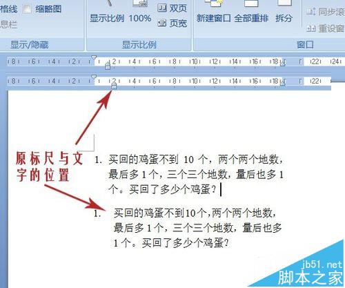 3、工具栏中点击视图,在显示/隐藏栏中勾选标尺,将标尺调出。图中红线标出的就是编号与文字之间的间距。