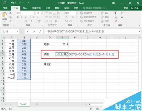 4、在Excel工作表的单元格中输入公式:=SUMPRODUCT((MOD(ROW(B1:B12),2)=0)*B1:B12)(隔行求和之偶数月)。如图所示;