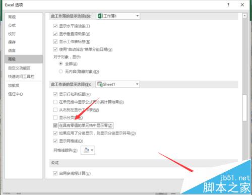 6、在“高级”选项卡的右侧窗格中,找到“此工作表显示选项”组中的“在具有零值单元格中显示零”选项,并在其复选框中将其“√”,然后再点击“确定”按钮即可。如图所示;